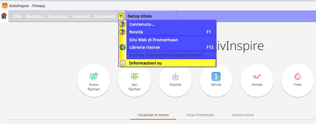 Quando lanciate il software ActivInspire, dal menu PUNTO INTERROGATIVO scegliete INFORMAZIONI SU (vedi immagine seguente: