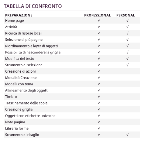 Alcune pragmatiche maestre mi hanno fatto notare che nella versione Personal (quella che si attiva anche senza inserire alcun codice di attivazione) ci sono tutte le cose che sono piaciute di più, come per esempio le ATTIVITA’ (creare il gioco MEMORY in pochi minuti, creare QUIZ ecc.). Questo è vero. Ma attivando la propria copia (quindi sbloccando le funzionalità PRO) si attivano moltissime funzioni utili. La lista completa delle differenze si può trovare nell’articolo n. 1887, dedicato alle caratteristiche di ActivInspire. Qui di seguito ecco solo una parte delle differenze (nel pdf ufficiale che trovate nell’articolo che ho linkato qui sopra troverete tutte le altre differenze):