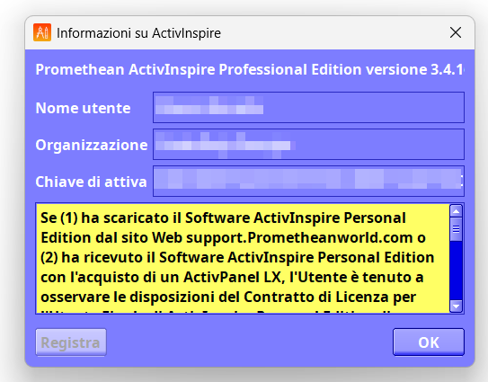 Ora, visto che UNA VOLTA CHE SI E’ REGISTRATO IL SOFTWARE ACTIVINSPIRE con una chiave di attivazione, quella resta nel vostro software e diventa non più modificabile, vi voglio spiegare come potete cancellare quella chiave (inserita durante il corso e relativa al pannello presente nell’aula della formazione) per inserire la chiave che trovate sotto o di fianco al pannello Promethean che avete in classe. Ecco di seguito le istruzioni.